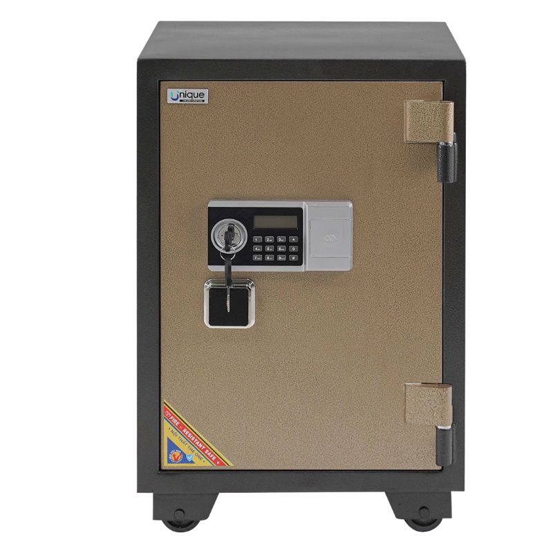 Két sắt UN76 mang phong cách hiện đại với thiết kế vuông vức, tay nắm kim loại sang trọng và lớp sơn tĩnh điện bền màu. Bên trong được bố trí khoa học với ngăn phụ và một đợt di động, phù hợp cất giữ giấy tờ, trang sức, tài sản giá trị. Khóa điện tử thông minh kết hợp khóa chìa truyền thống giúp an tâm tuyệt đối. Bánh xe sắt chịu lực hỗ trợ di chuyển tiện lợi. Với trọng lượng 76kg và kích thước tiêu chuẩn, UN76 là lựa chọn hoàn hảo giữa thẩm mỹ, độ bền và an toàn.