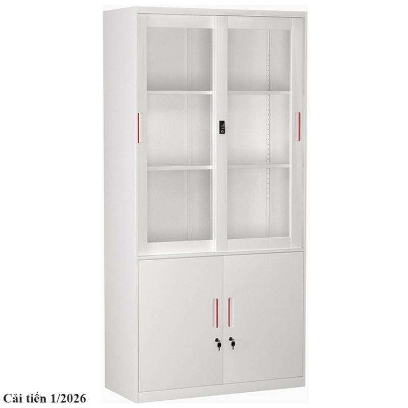 Sự kết hợp với cánh kính càng làm tăng vẻ đẹp thẩm mỹ cho tủ. Thiết kế vừa giúp người dùng dễ xác định tài liệu, hồ sơ. Vừa tạo cảm giác không gian thông thoáng hơn.